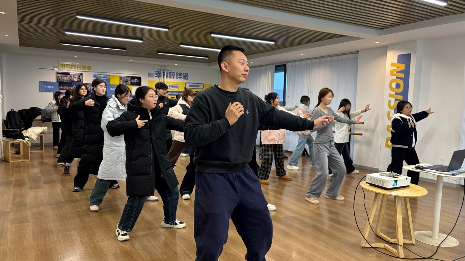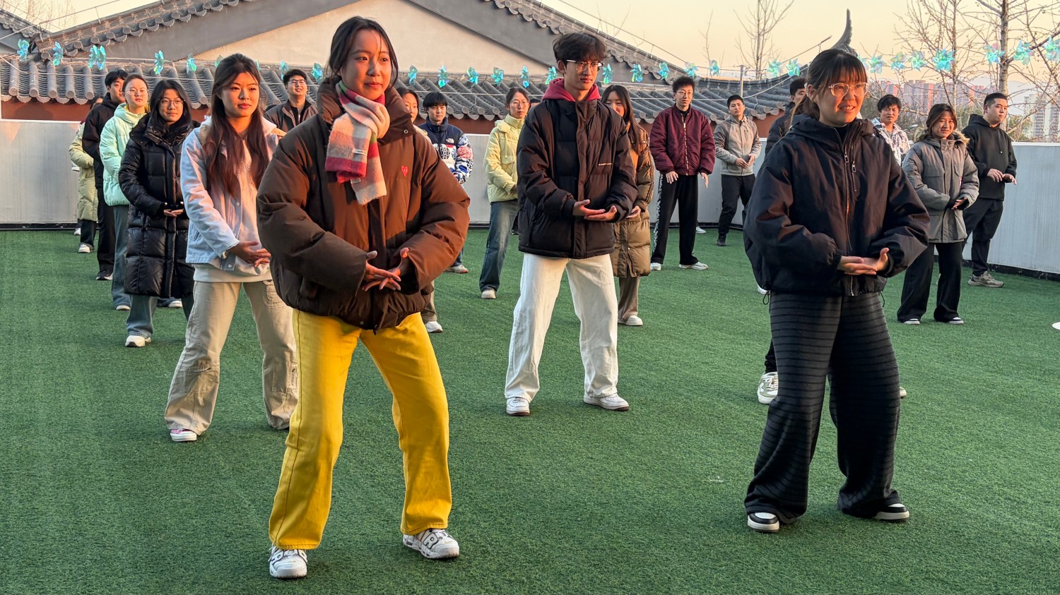 万物顺时而生,功法顺韵而修。一周后的11月19日,毣谷书院三楼蘑菇·天台,我如约而至来到了第二期“解锁‘身体’的开关”活动在这里如期而至。主持人高春琪的开场白依旧简洁,动感音乐响起,李晶老师带领着我热身,僵硬的肢体在节拍中渐渐苏醒。天台的风带着草木的清香,我跟着老师抬手、扩胸、弯腰,起初遗忘的动作慢慢变得流畅。我听到我旁边的同学悄悄说:“上次练完肩膀酸,这次居然感觉舒展多了。”夕阳西下,余晖洒在每个人专注的脸上,动作整齐划一的队伍,成了天台上最动人的风景。最后的“多人抱团”游戏打破了静谧,随着主持人喊出数字,我和同学们笑着奔跑、相拥,没抱成团的同学被调侃着接受采访,笑声顺着晚风飘向远方。