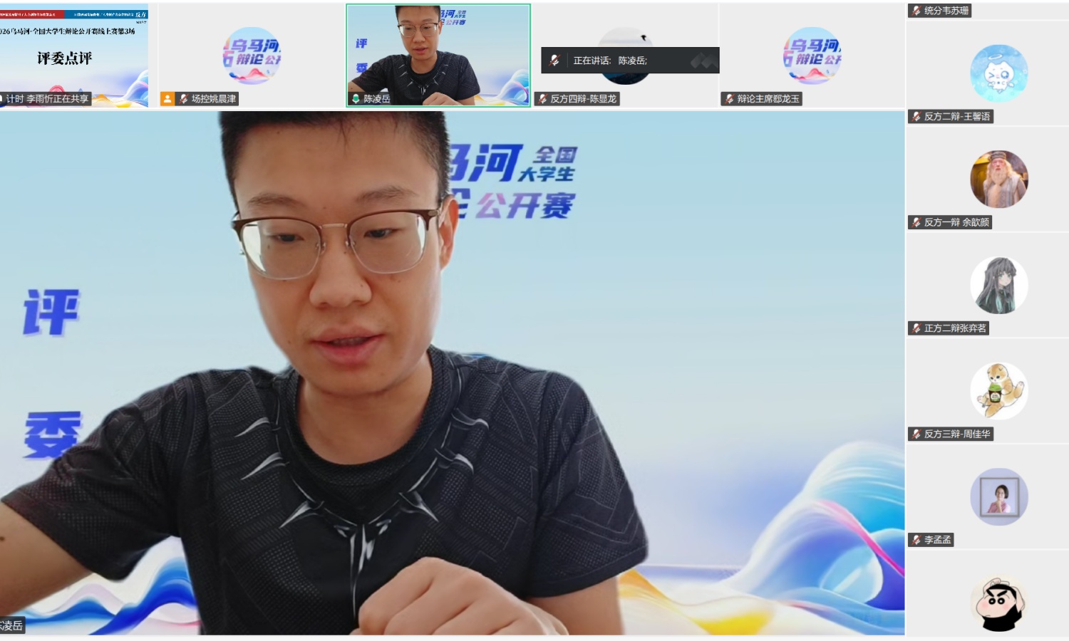 线上预选赛战火全开,为期两天的16轮角逐聚焦两大前沿辩题—“AI的迅猛发展提升了/降低了人类创作者存在的意义”“AI恋人能/不能缓解当代人的孤独”。来自全国32支参赛队伍展开激烈思辨,金句频出间尽显青年学子的逻辑素养与时代关切。陈凌岳院长担任第3场、第7场、第11场、第14场的评委,他均围绕辩题拆解与攻防核心展开述票,帮助辩手看清胜负关键与提升方向。
