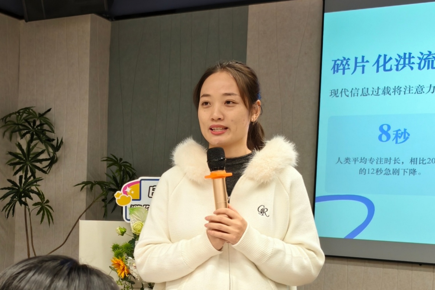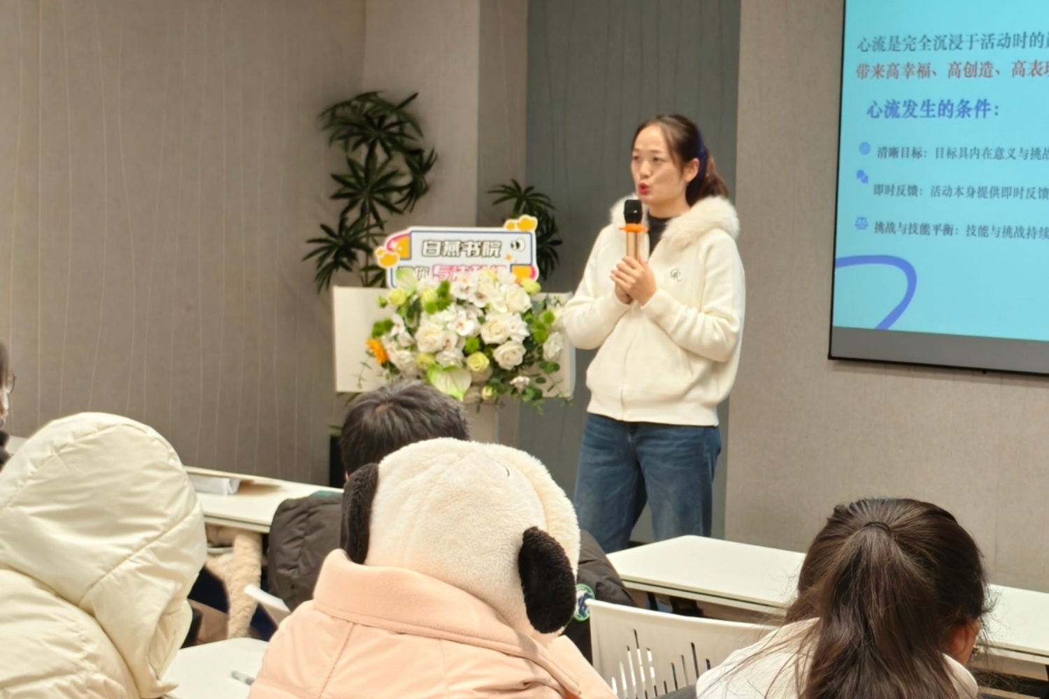 这场体验只是起点。随后,刘采梦博士在讲座中深入剖析了“专注力与心流”这一主题。她指出,信息碎片化时代使人们平均专注时长降至8秒,而真正的专注不是对抗干扰,而是通过创造合适条件主动进入“心流”状态——那种全情投入、忘我沉浸的巅峰体验。她特别警示了短视频等“低门槛心流”的陷阱,强调需要将注意力“投资”在值得长期投入的事情上。