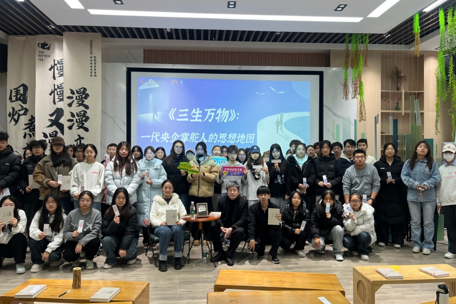 理念的价值在于践行。在“三生万物”读书分享会上,同学们通过抽取书中金句、分享感悟,将抽象思考与个人经验相连。陆思懿同学抽到“人是时代的产物”,结合自己的专业选择谈到家庭与时代的塑造;张丽清同学则围绕“善良才有智慧”,分享了自己在志愿服务中的体会。随后,喻丰教授与刘采梦博士从学术视角进行点评,喻教授格外认同书中对时代与个人关系的洞察,并联系“00后”大学生的特质进行了生动解读;刘博士则从认知科学角度提醒,真正的智慧离不开对他人的理解与善意。
