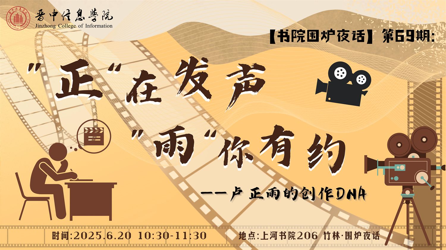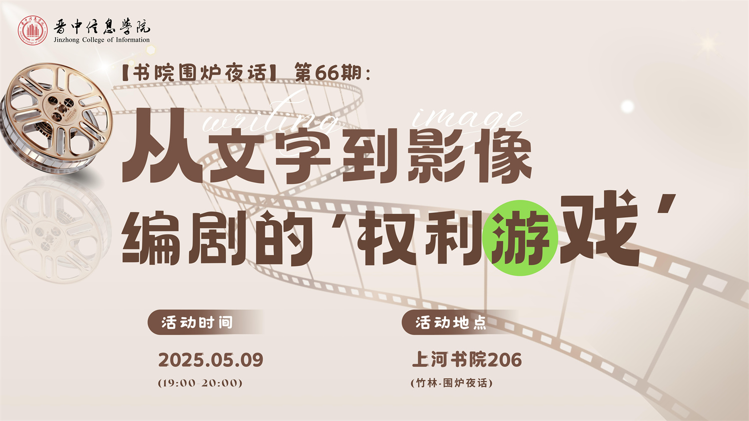 由书院部主办,三达书院、名师课堂、智能工程学院承办的第66期“书院围炉夜话”将于5月9日(周五)19:00-20:00,在上河书院206竹林·围炉夜话与大家见面,本次做客的嘉宾是著名编剧、制片人曹小林。曹小林,著名编剧、制片人、监制、讲师、影视投资人。情景剧《爱情公寓》《爱情上上签》等热播剧主创,开心麻花资深编剧,新片场影业文学总监、喜得影业创始人。他将带着从文字到影像的奇妙魔法与大家开启一场关于编剧创作思路的深度对话【...